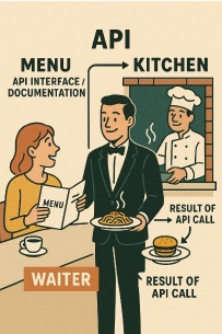 An Application Programming Interface, also known as an API, allows systems to communicate with each other. A great analogy on how an API works is to imagine yourself at a restaurant, and as the customer you have a request (your food order). When you sit down, the waiter gives you a menu—this is the API documentation or interface. It lists exactly what you can order and what you can retrieve with your request. The waiter is the API itself, as they take your order to the kitchen. The kitchen is the database or server where the information is held. When your meal (API request) is ready, the waiter will bring it back to you. The waiter in the restaurant and in the API request are necessary to get your food and your intended result.